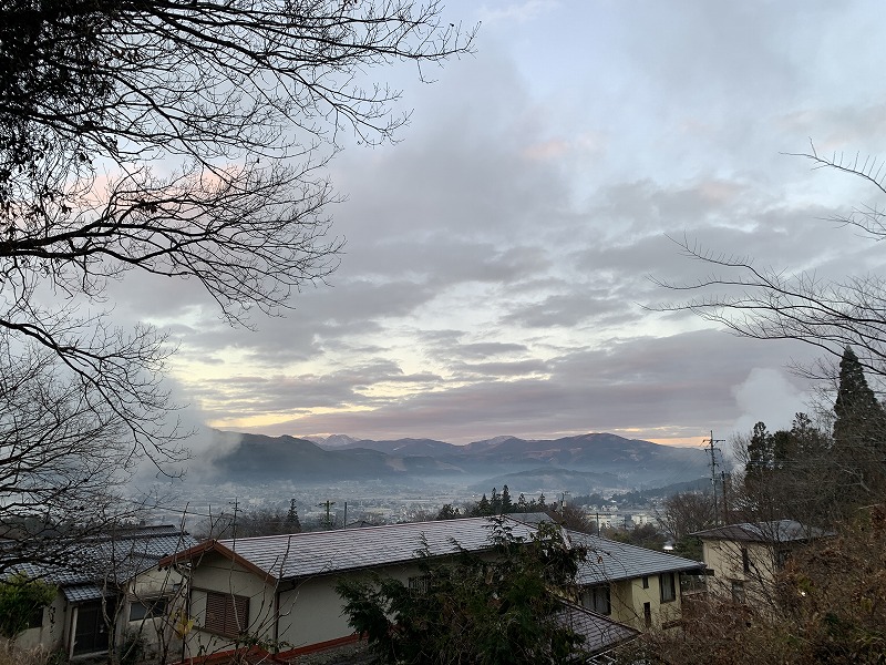 日が昇ってから宿の近くを散策した。さすがに湯布院の朝は冷え込みが厳しい。霜がバリバリにはっていた。高台になるので由布の街が雲海になってないか期待したが、そう簡単には見せてくれなかった。