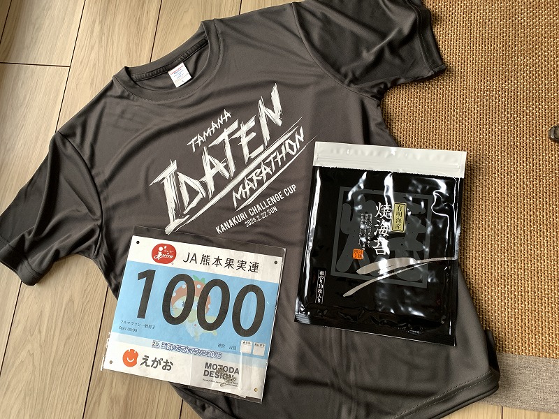 帰宅すると玉名から郵便が届いていた。「玉名いだてんマラソン」からだった。開けてみるとゼッケンとTシャツ、参加賞の海苔が入っていた。