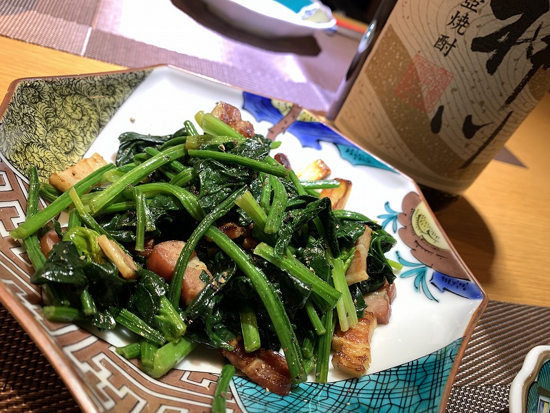 天神で買い物してぶらぶらと帰宅。夜は焼酎で酒盛り。ワシは「ほうれん草とベーコンのバター醤油炒め」を作った。