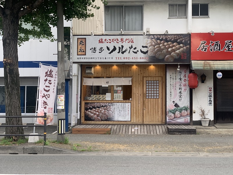 昔はお祭りなどのイベントがあると、的屋がずらりと並んだものでしたが、時代は変わって今ではキッチンカーが並ぶようになりました。しかもどのキッチンカーのメニューもなかなかにレベルが高くなりまして、本当にどれにしようか迷うことがよくあります。最近は鴻臚館広場でよくイベントがあってキッチンカーが並んでるのをよく見かけます。そういう時にえしぇ蔵が「あのお店来てるかな?」と探す店がいくつかありますが、その一つがこの「博多ソルたこ」です。見つけると必ず買います。ここのたこ焼きは本当にはまります。ソルたこのソルはソルトのことで、塩で食べさせるたこ焼きです。甘辛どっぷりのたこ焼きと違ってさっぱり感があって、しかもほんのりとついた塩味がたまりません。しかも焼き具合がバッチリで、外側の食感と中のトロトロ感が絶妙です。そこに大きなタコがどーんと入っています。タコは真蛸のみ、塩や粉にもこだわっており、食材の質も高いです。店舗は博多区那珂にありますが、イベントにキッチンカーが並んでる時は探してみるのもいいと思います。是非一度お試し下さい。ビールにも合います。