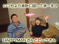 今日は夜「プチえせ会」があった。今回は「すし富」で別名「寿司えせ会」。最後のお客さんが終わってからろびんちゃんと御前を拾ってお店に向かった。御前は車の中でしゃべりっぱなしだった。えせファミリー最年少のろびんちゃんに「いつまでも若いと思うな」と説教してた。 「私が21の頃はねー、寮に入っとってからねー、酔っ払って帰ってきたら全室まわって『ただいまー』って言いよったもんよ。酔っ払って気持ちがいーっていうのをみんなに知らせたかったと」 あんた21の頃からそんなんかい。 「あー!見て見て!でっかい熊が踊りよるー!」 あるお店の前に置いてある等身大の熊のぬいぐるみがくねくね踊ってるの見てはしゃぐ御前。こいつは静かにしとくっちゅーのはできんのやろか? お店に着いたら次郎吉と三瀬もんさんが来てた。他の人たちもすぐに集まって、宴会は始まった。 石田しゃちょー 三瀬もんさん ろびんちゃん ビッケさん オーシゲさん HAPPYMANさん 姐さん AKIKOさん イノ 御前 次郎 吉 蔵 参加者は以上の13名だった。刺身、寿司、潮汁どれもうまかった。サーモンとあなごにはマジ感動した。ビッケさんとAKIKOさんはさび抜きがいいと言ってたのに吉がお店の人に伝えるのを忘れて二人はブーイング。反省した吉は部屋の端の方でこつこつと二 ![]() たまたま引越しの作業で福岡に来てたHAPPYMANさんも来てくれた。スペシャルゲストという扱いだったがちゃんとお金は貰った。吉が焼酎をプレゼントしていたが、帰りには店に置き忘れるところだった。 オーシゲさんが大道芸を見せてくれた。三瀬もんさんはオーシゲさんが簡単に皿をまわすのを見て「そんなん俺もできる!」とか言って挑戦したけど廻せずに、意地になってひたすらチャレンジしてた。その後はお約束の「おれもおれも状態」。できもしないのにみんな挑戦してお店の2階は大騒ぎ。次郎は皿を廻せないわ、石田しゃちょーは真剣におてだまやってるわ、イノと吉は意地になって風船膨らませてるわ、HAPPYMANさんはパイロンで遊んでるわ、...一体どういう集団や!中にはお手玉をやってて放り投げたお手玉が鍵がかかってる隣の部屋に落ちてお店の人に開けてもらうなどという失態を演じてる人もいた。全くしょうがない人だ。 最後はお店の前で集合写真を撮って解散した。あぁうまかった。 家に帰ってから次郎に「明日ゴミ出しよー!」って電話したら嫌そうに「ふぁ〜い」と答えていたが、よく考えるとゴミだしはあさってだった。 寿司えせ会写真集 |