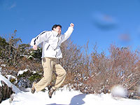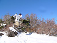 頂上に着いた時は爽快な気分。地上は真っ白だが空は真っ青だった。最高の天気。ここでパンを食べてから恒例のジャンプ。いろんな人に「今年も飛ぶんですか?」と訊かれたので飛ばないわけにはいかない。